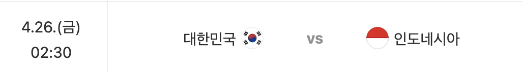 | 04.26(금) 02:30 | 대한민국 vs 인도네시아 |