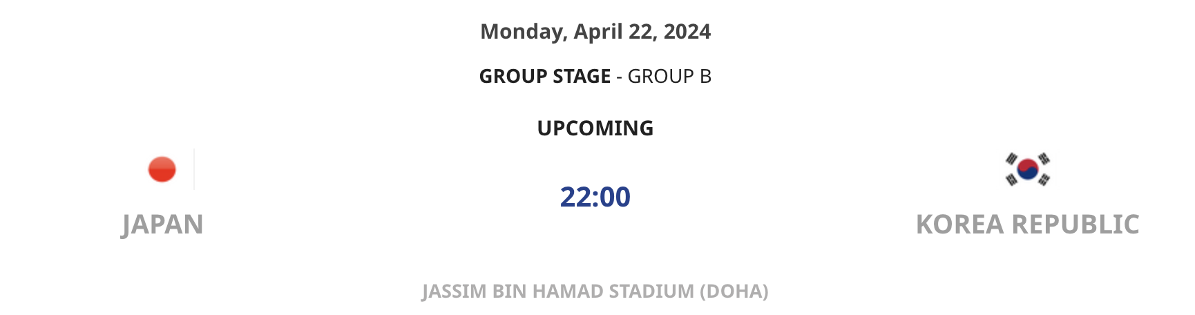 | 04.22(월) 22:00 | 일본 vs 대한민국 |